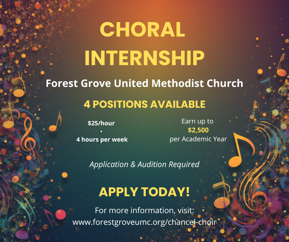 Interested in a choral intern position? Click here to view the job description. Contact the Forest Grove United Methodist Church at fgumcorg@gmail.com to apply.
